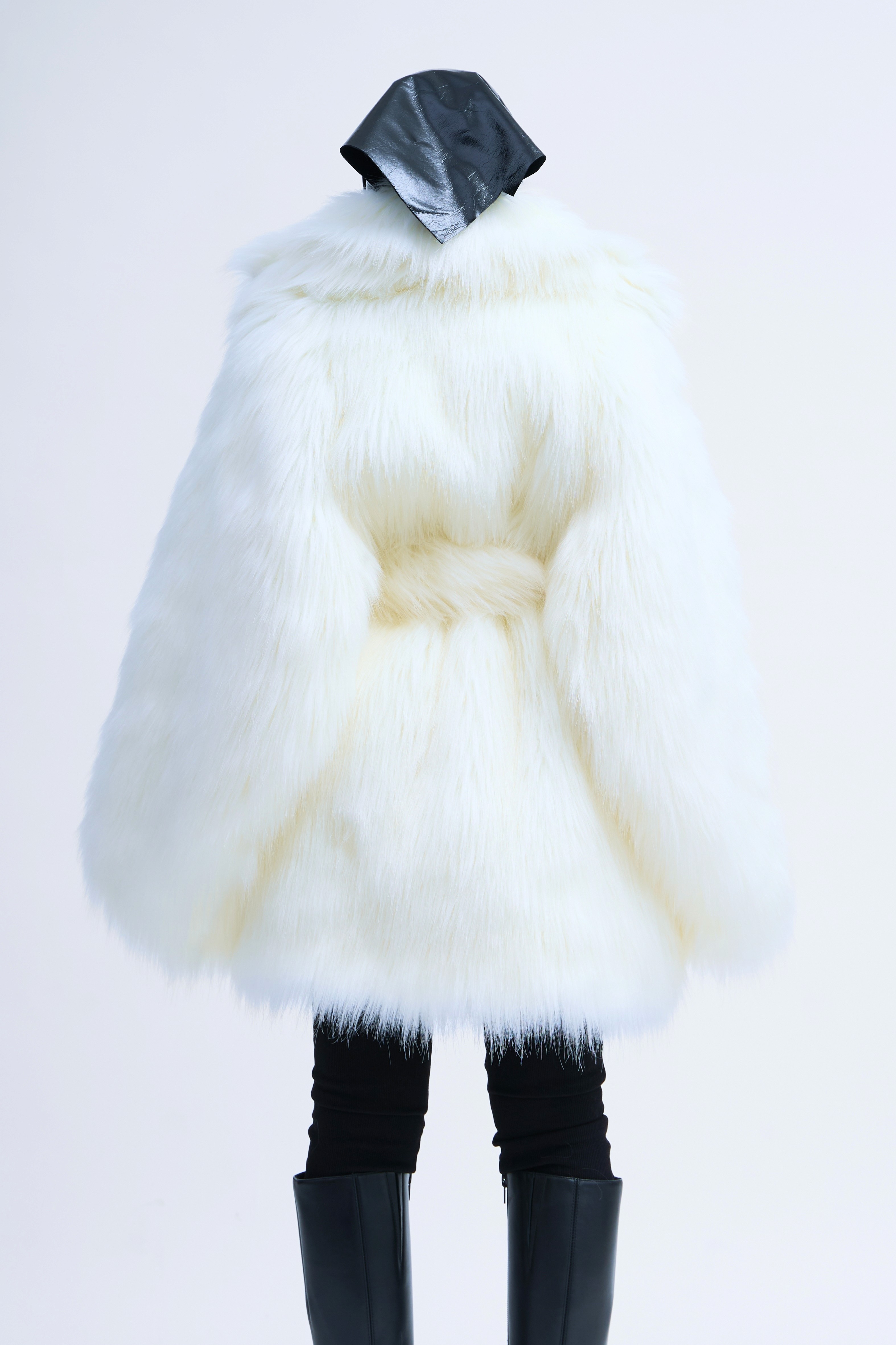 The coat is made of 100% eco-friendly faux fur. The fur is distinguished by its density and thickness. The coat features a large blazer-style collar and front seam pockets. It has voluminous long sleeves. A belt is placed at the waist. The coat is suitable for temperatures down to -15°C.