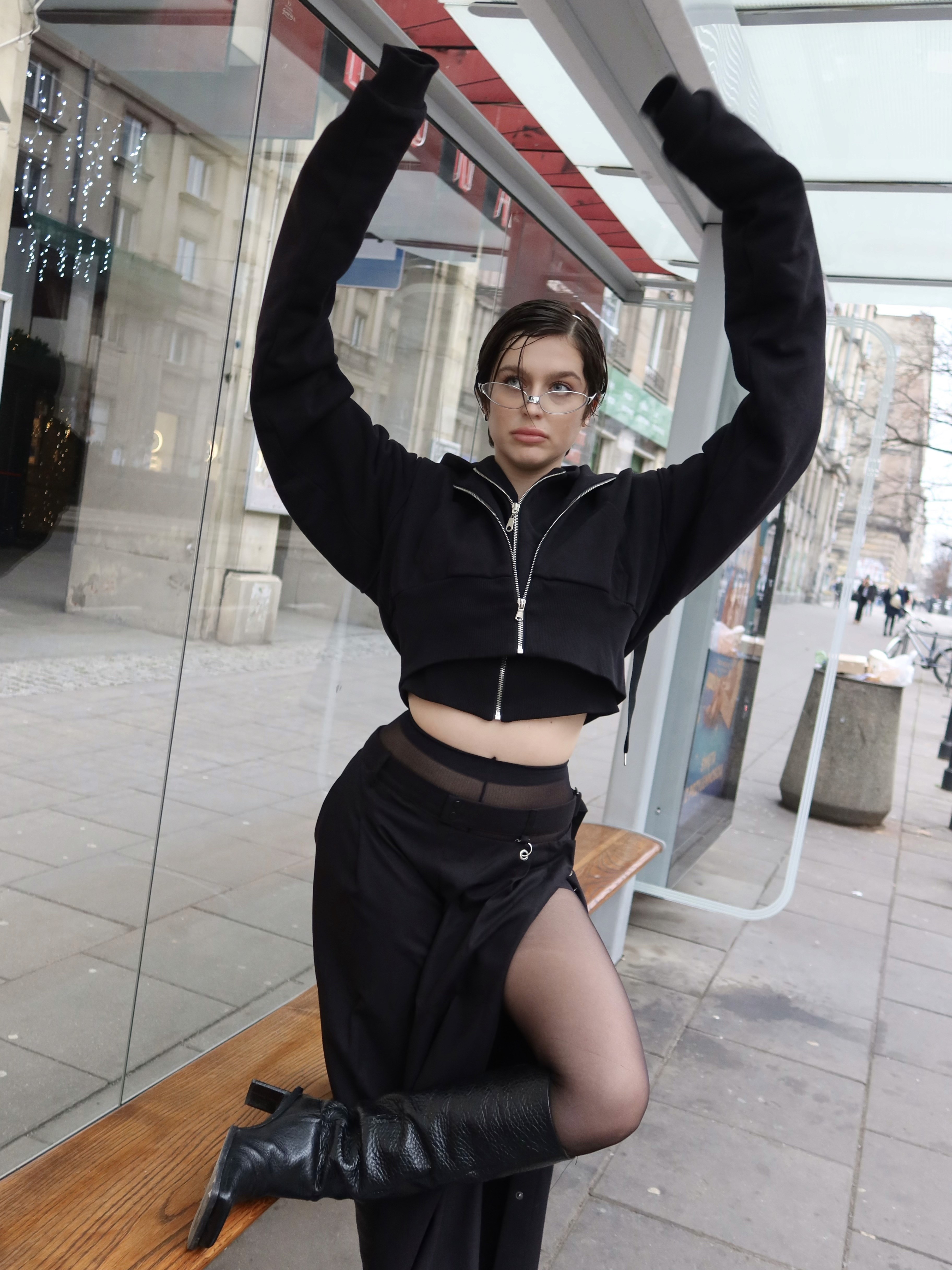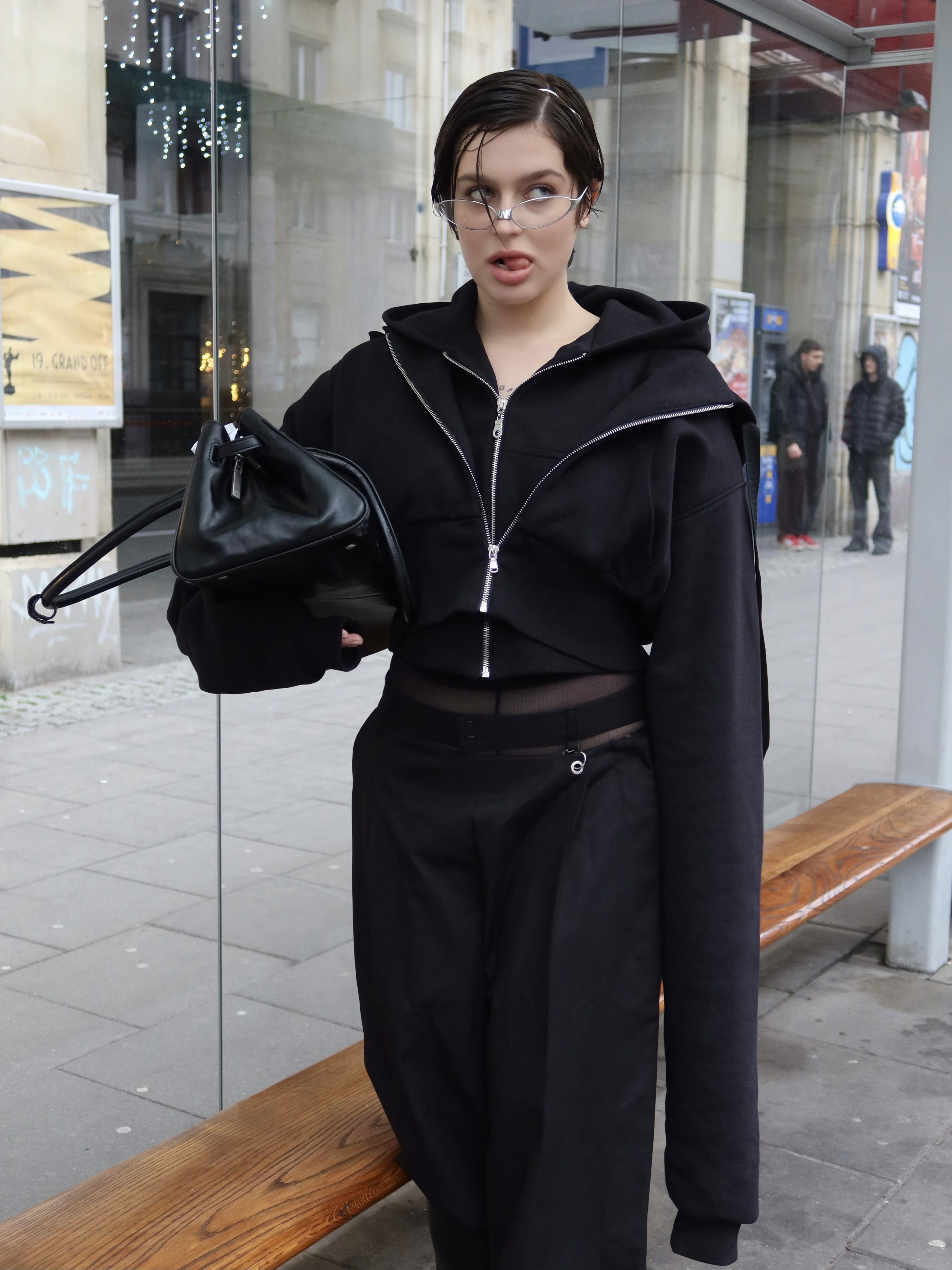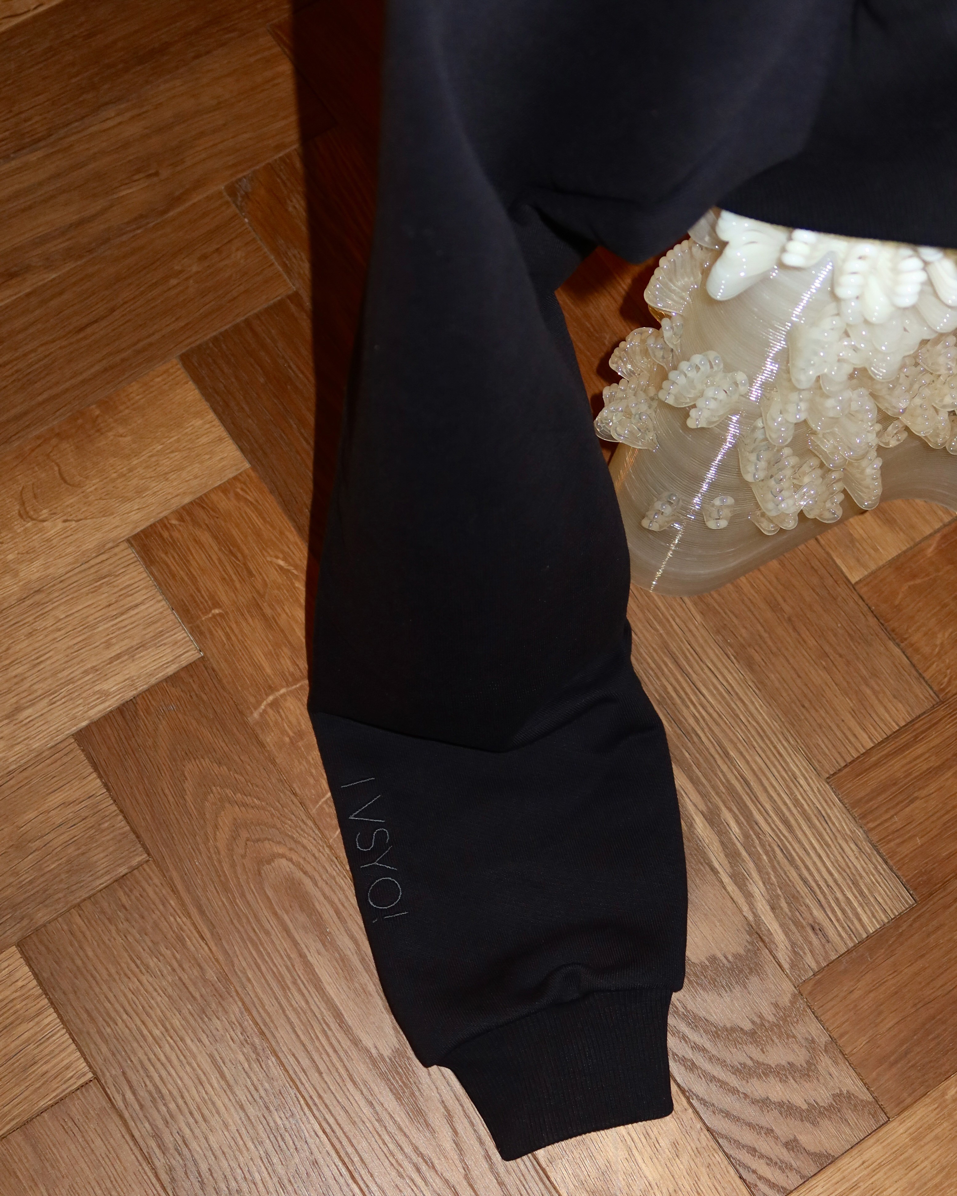 A cropped hoodie with detachable shoulder pads. Made from a dense fabric, this hoodie features an oversized hood and disproportionately long sleeves. The left sleeve is embroidered with the phrase “I Vsyo.” It has a front zip closure and front patch pockets.