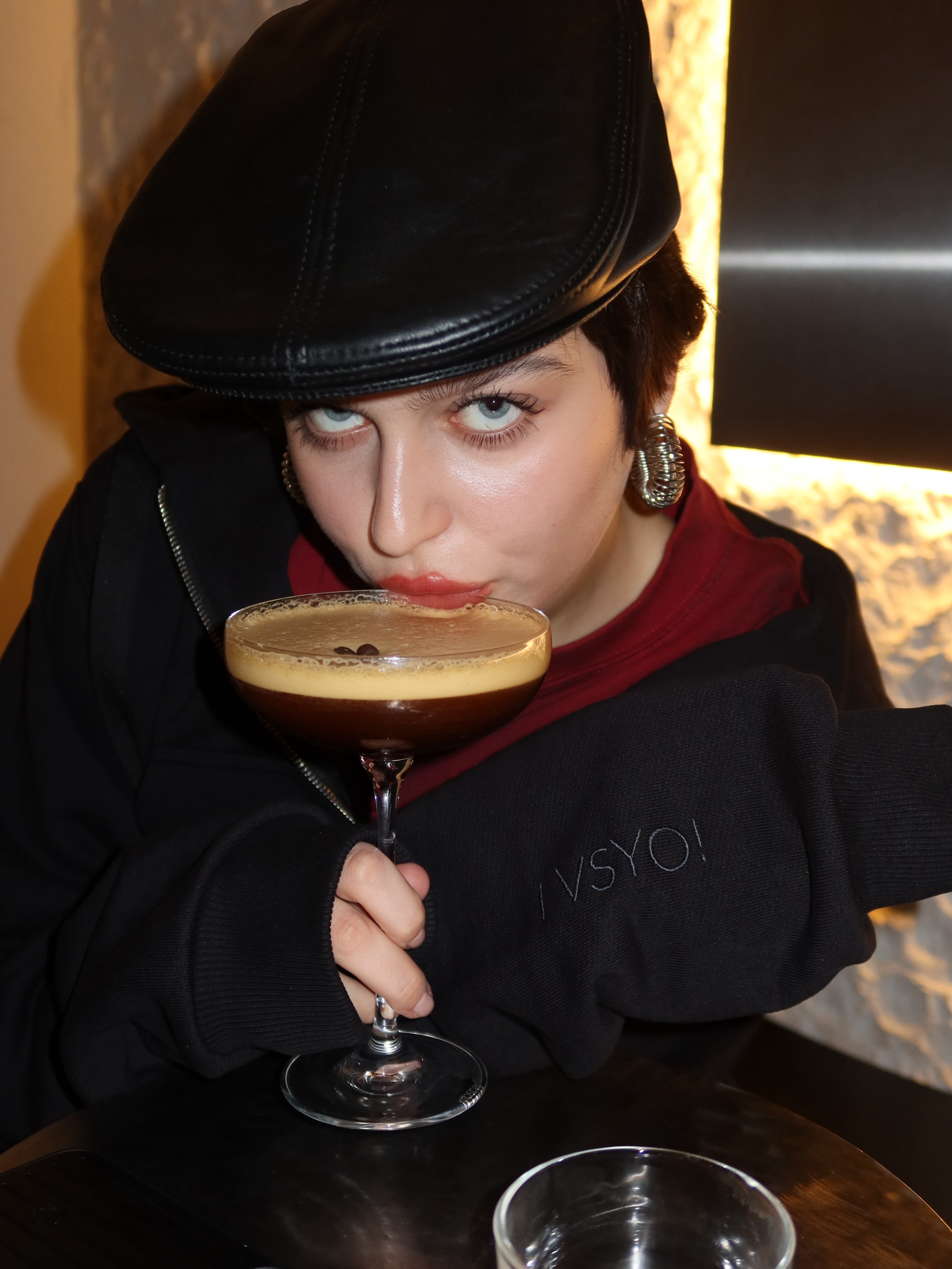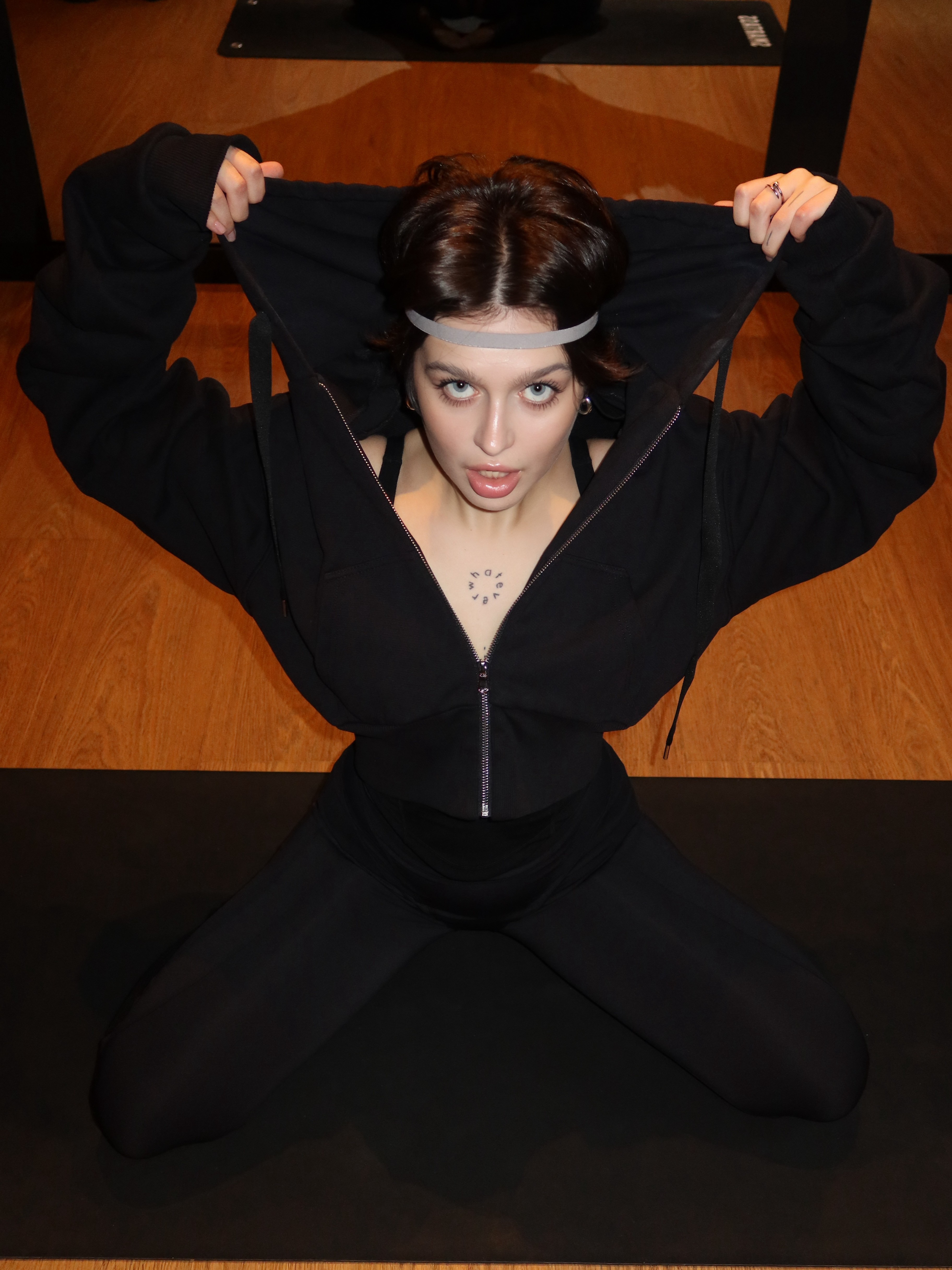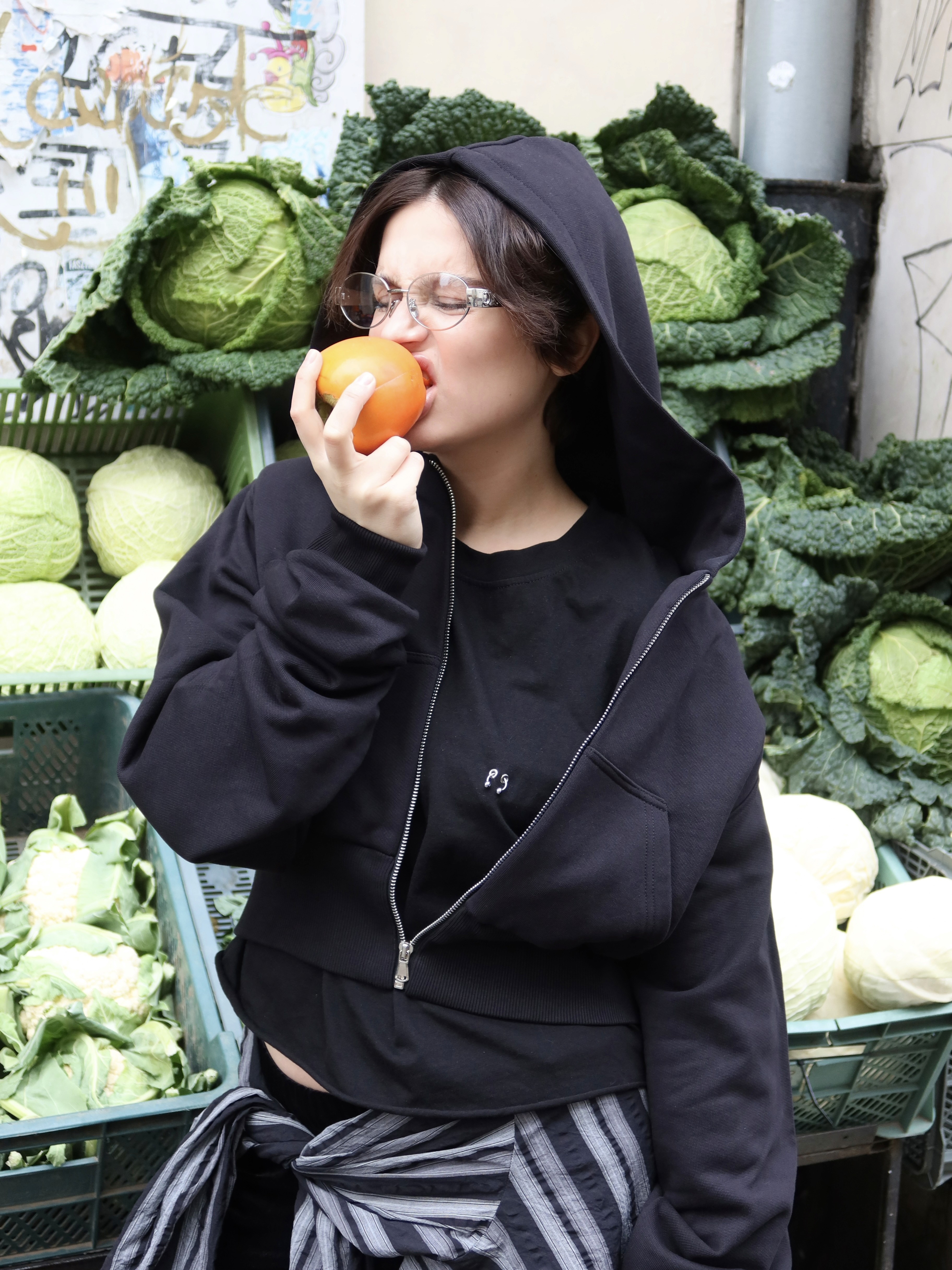 A cropped hoodie with detachable shoulder pads. Made from a dense fabric, this hoodie features an oversized hood and disproportionately long sleeves. The left sleeve is embroidered with the phrase “I Vsyo.” It has a front zip closure and front patch pockets.
