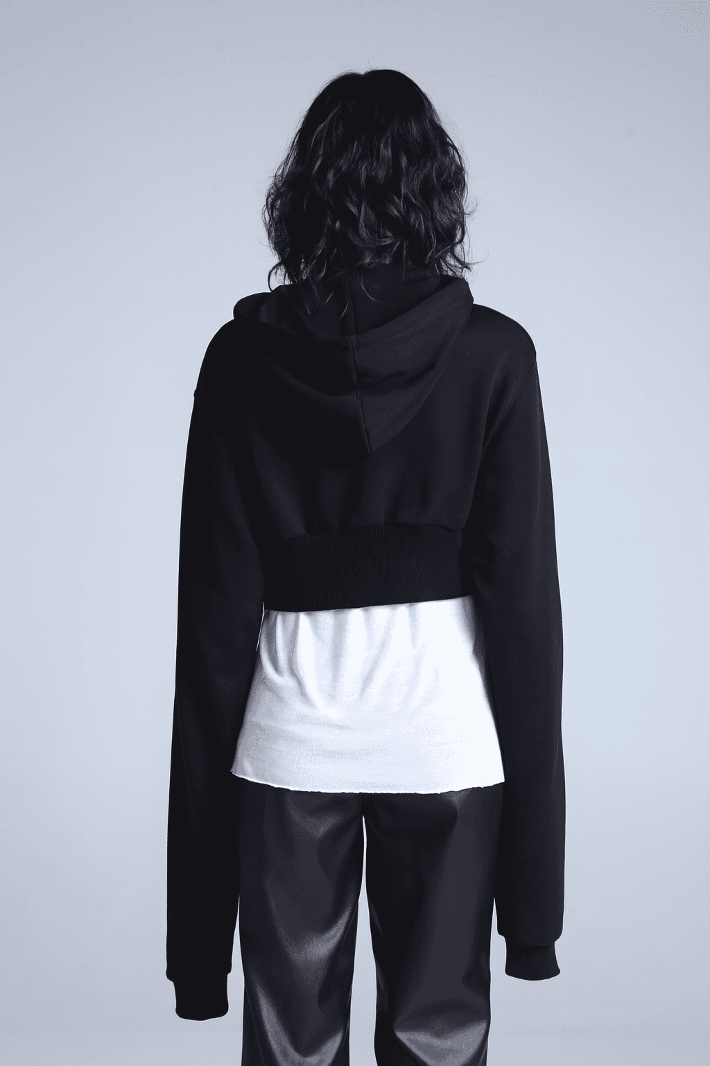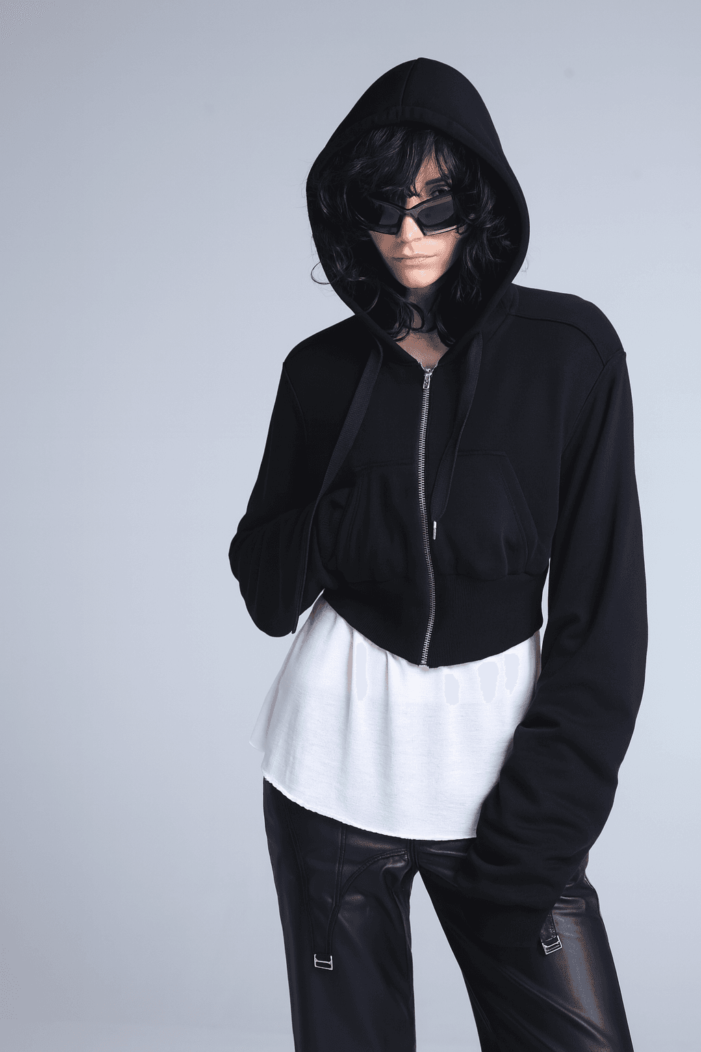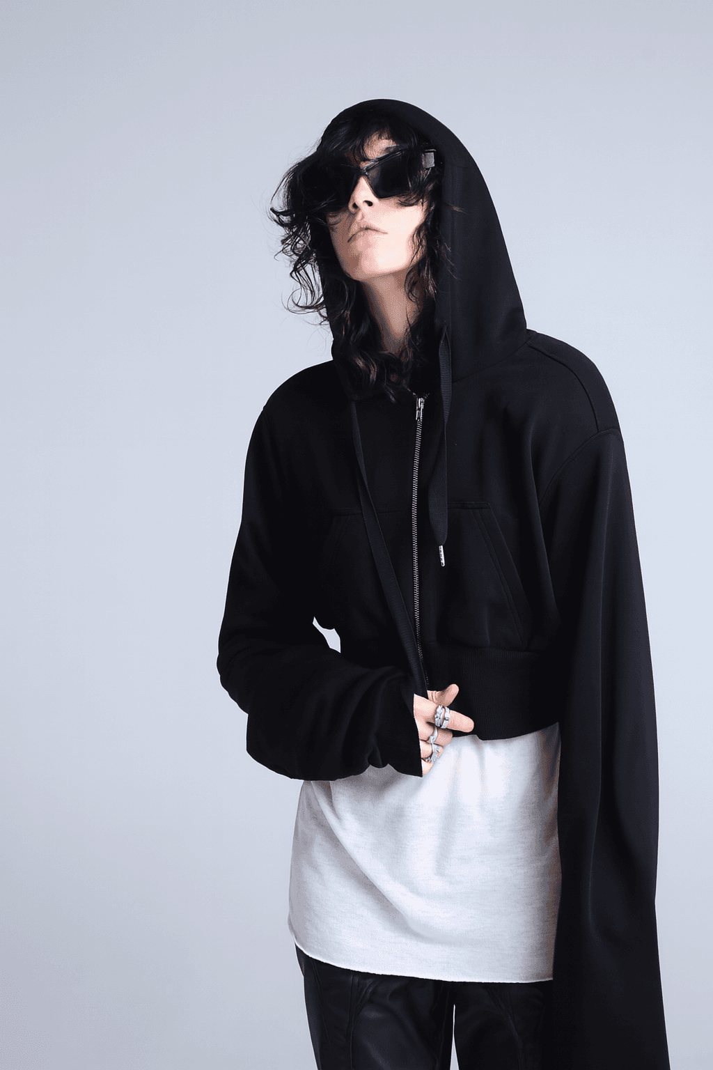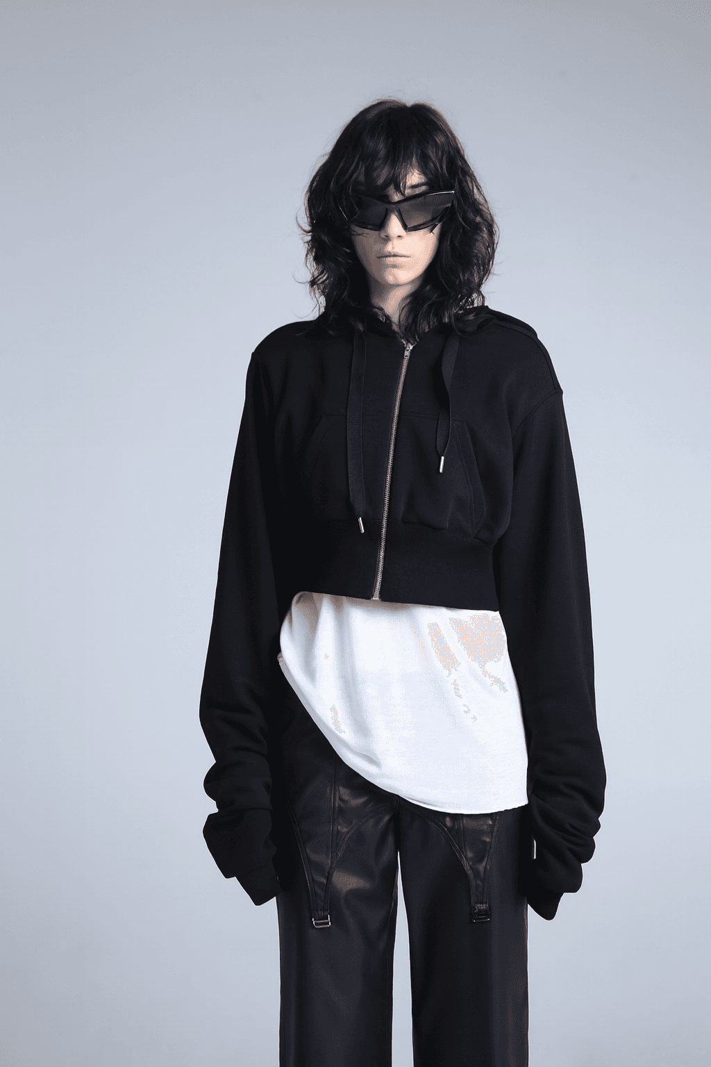A cropped hoodie with detachable shoulder pads. Made from a dense fabric, this hoodie features an oversized hood and disproportionately long sleeves. The left sleeve is embroidered with the phrase “I Vsyo.” It has a front zip closure and front patch pockets.
